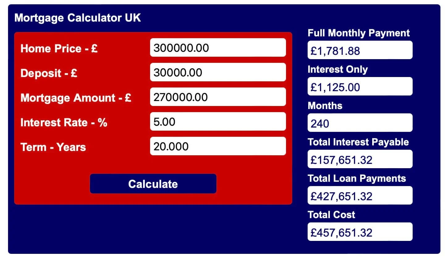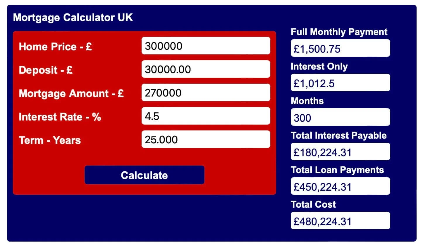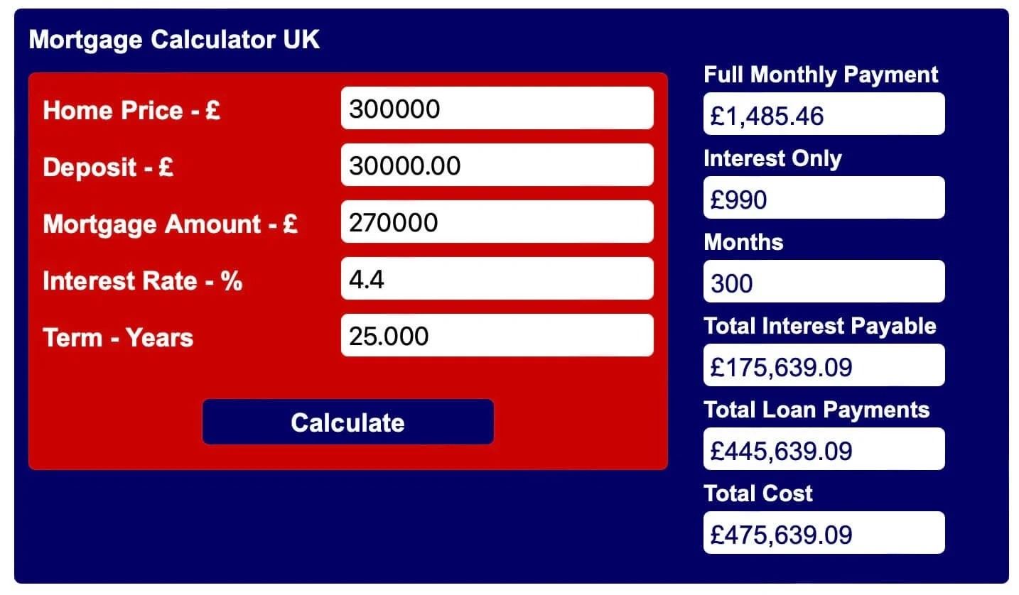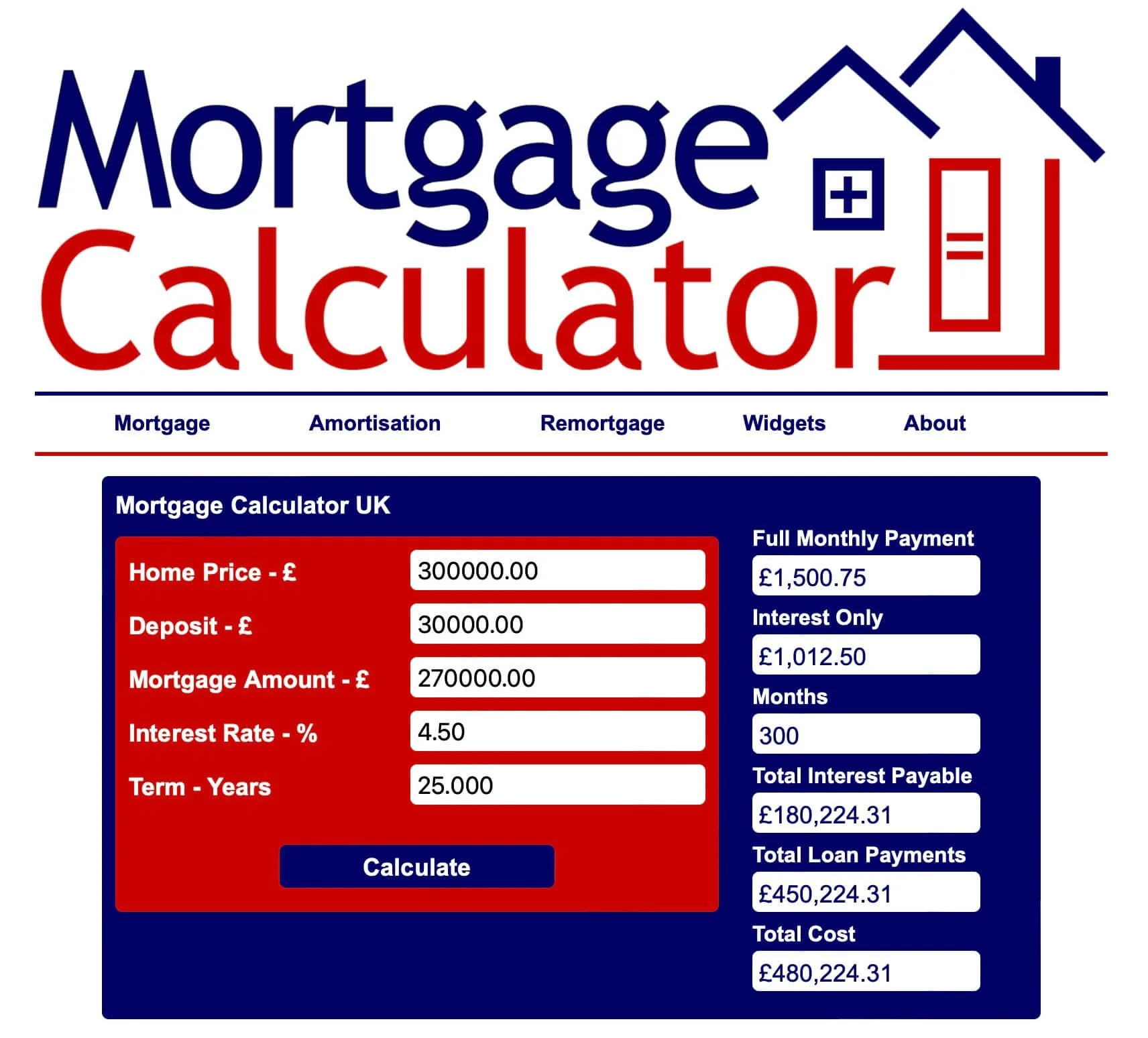 In this scenario, having a 4.5% interest rate rather than 4.4% would mean you pay £4,585 more in interest and your monthly payment would be £15/month higher.